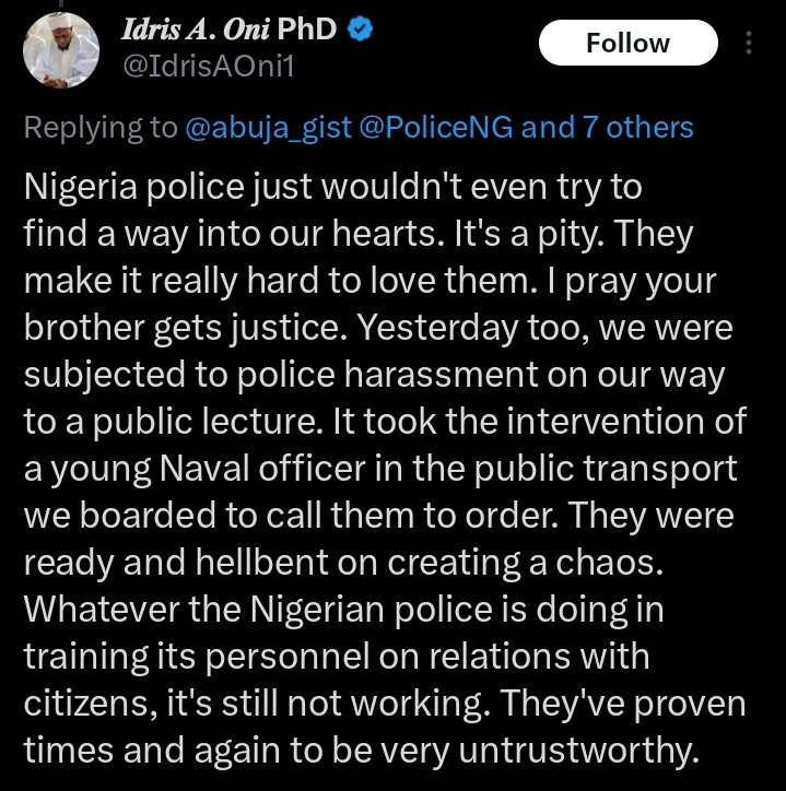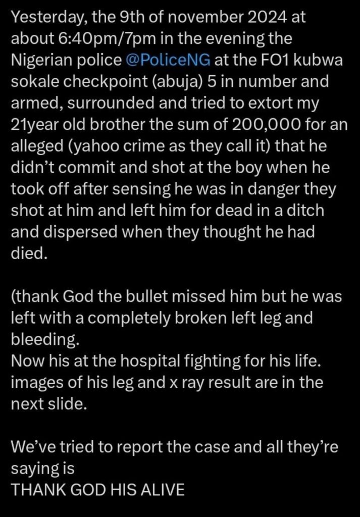 A social media user has reported the unpleasantness of the Nigeria police experience the family had after his 21 years old brother was shot and left to die in a ditch in Abuja.