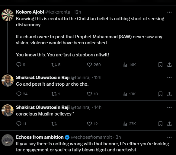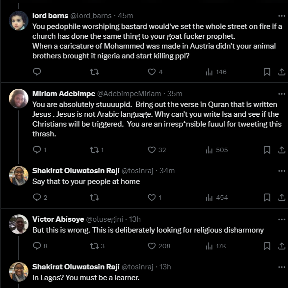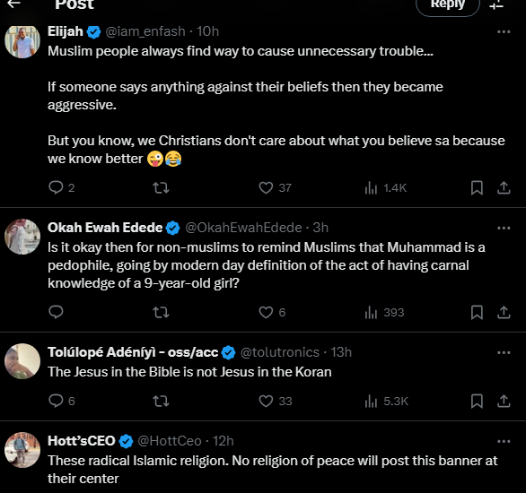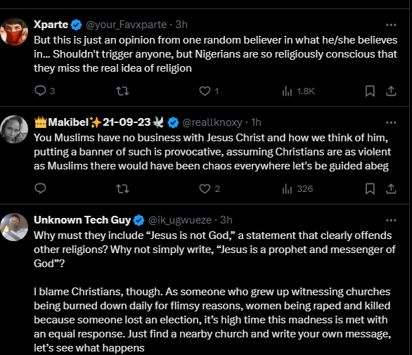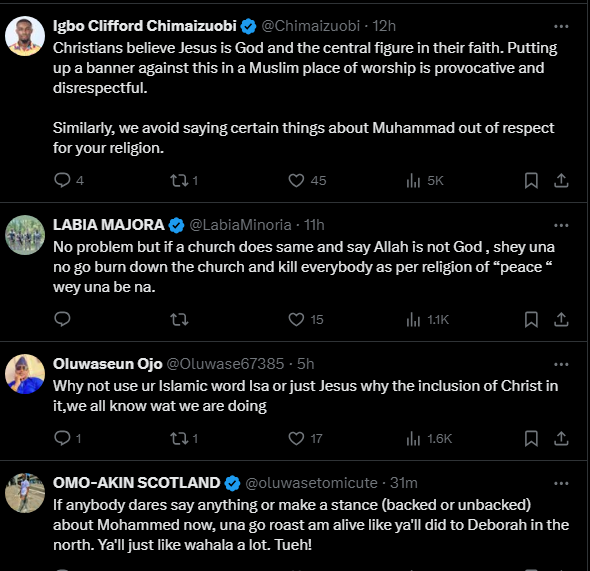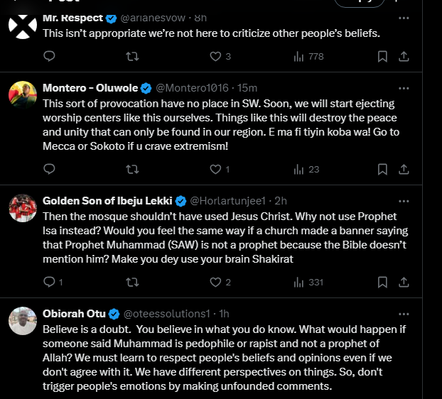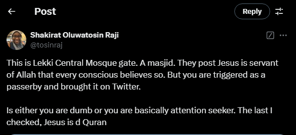 News50 0 by thesubstancenewsDecember 18, 2024December 18, 2024 A Central Mosque (a masjid) in Lekki, Lagos state posted on its gate, ‘Jesus is servant of Allah’ thus causing controversies on the social media between Christians and Muslims faithful.
