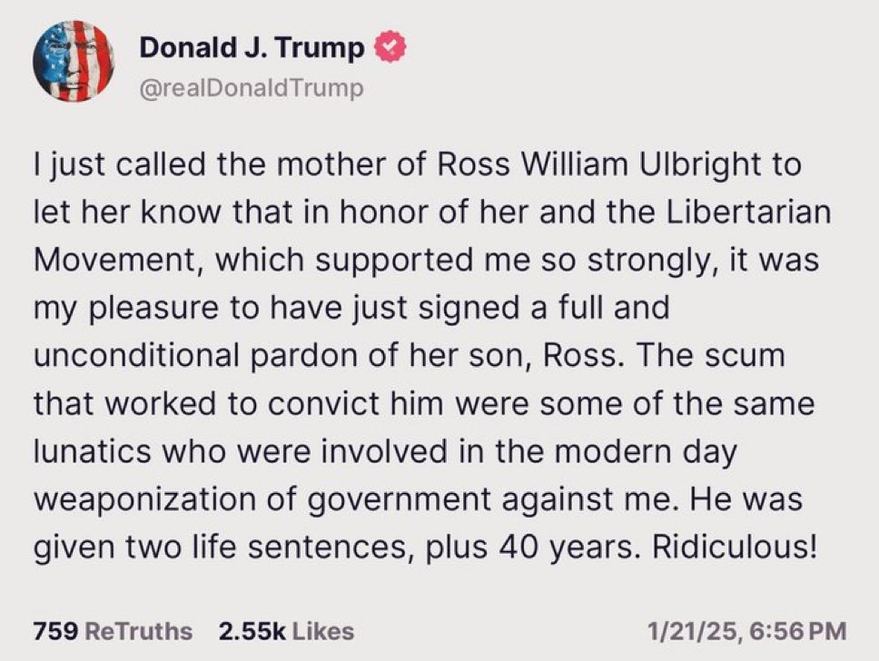 The website was known for its illegal drug marketplace, among other illegal and legal product listings, however Trump on resumption of office called the convict mother saying he has signed “full and unconditional pardon” for her son,