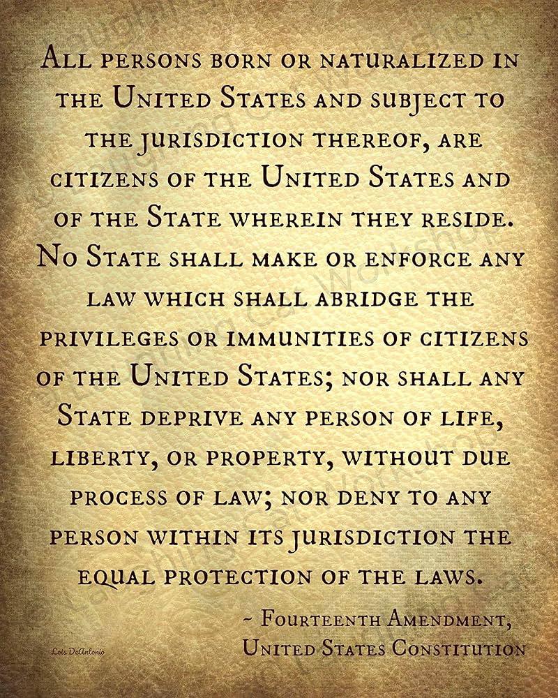 All persons born or naturalized in the United States, and subject to the jurisdiction thereof, are citizens of the United States and of the State wherein they reside. No State shall make or enforce any law which shall abridge the privileges or immunities of citizens of the United States; nor shall any State deprive any person of life, liberty, or property, without due process of law; nor deny to any person within its jurisdiction the equal protection of the laws.