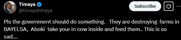 “Pls the government should do something. They are destroying farms in BAYELSA, Aboki take your in cow inside and feed them.. This is so sad…” he lamented.