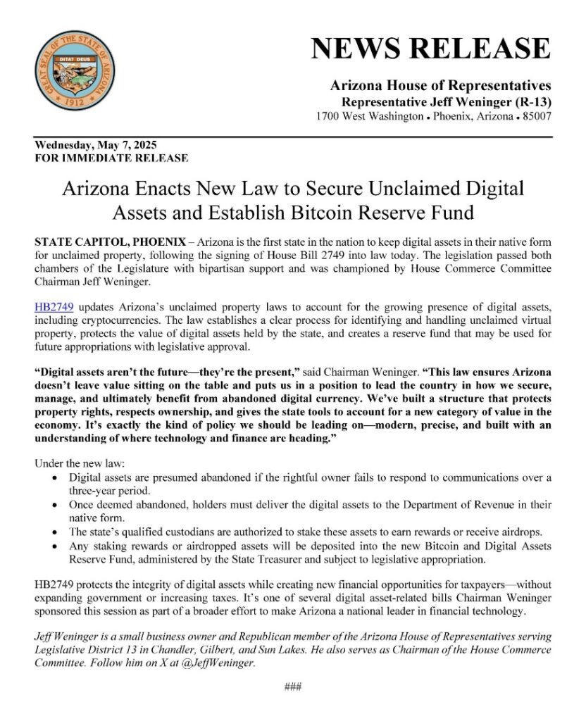 Arizona Gov. Katie Hobbs signed House Bill 2749 into law on Wednesday, establishing a state-managed Bitcoin and Digital Assets Reserve Fund that will hold unclaimed digital assets and staking rewards.