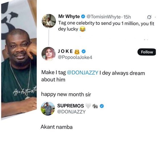 Tomisin asked tweeps to tag one random celebrity to send them money a few boldly tagged Don Jazzy.