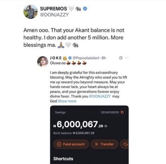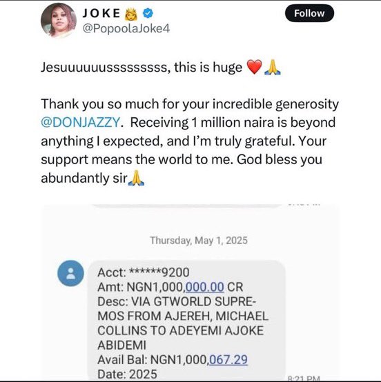 However her destiny helper wasn’t happy with her account balance and had to add another 5 million naira and has sent ₦1million to four lucky fans.