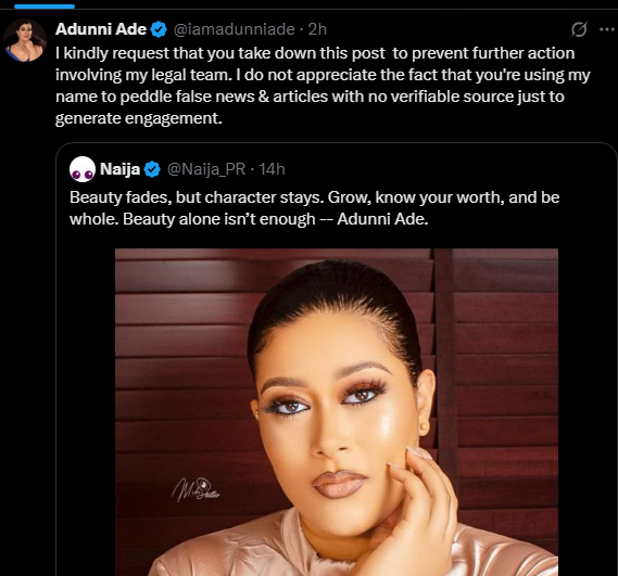 “I kindly request that you take down this post to prevent further action involving my legal team. I do not appreciate the fact that you’re using my name to peddle false news & articles with no verifiable source just to generate engagement.” Adunni Ade