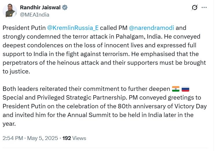 Putin tells PM Modi “It is important to bring perpetrators and their supporters to justice for the heinous act.” Putin reaffirms his commitment to strengthening India-Russia ties.