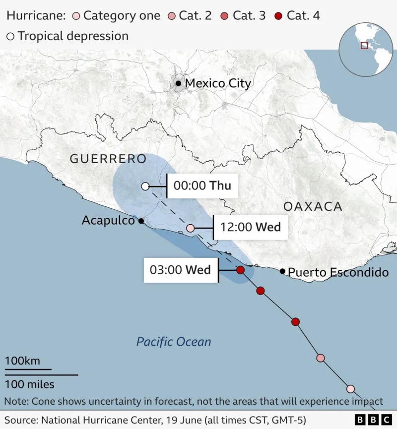 A hurricane warning is in effect for a 500km-stretch (300 miles) of Pacific coast, from the resort town of Acapulco to Puerto Ángel.