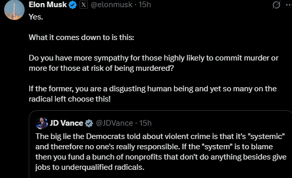 Elon Musk Knocks US Vice President JD Vance Over Summation On “Small Group Of People” That Commit Violent Crime In An Uproar Against Repeat Violent Offenders
