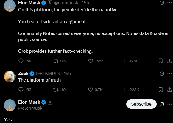 Musk while correcting Navarro wrote: “On this platform, the people decide the narrative. You hear all sides of an argument. Community Notes corrects everyone, no exceptions. Notes data & code is public source. Grok provides further fact-checking”