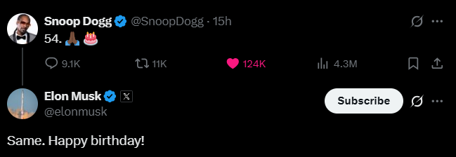 American Rapper Snoop Dogg Celebrates 54 Birthday, Musk Celebrates Him, Reveals They Are The Same Age