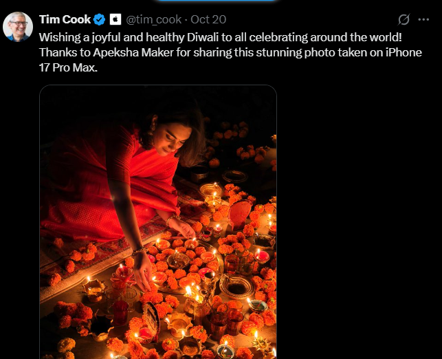NewsApple CEO Tim Cook Slides In iPhone 17 Pro Max Advert While Wishing Happy Diwali To Celebrants All Over The World20 by thesubstancenewsOctober 21, 2025October 21, 2025 Tim Cook: “Wishing a joyful and healthy Diwali to all celebrating around the world! Thanks to Apeksha Maker for sharing this stunning photo taken on iPhone 17 Pro Max.” the Apple CEO wrote on X