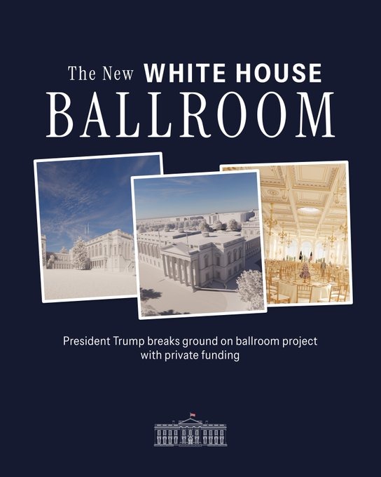 “I am pleased to announce that ground has been broken on the White House grounds to build the new, big, beautiful White House Ballroom… The White House Ballroom is being privately funded by many generous Patriots, Great American Companies, and, yours truly.” President Trump wrote