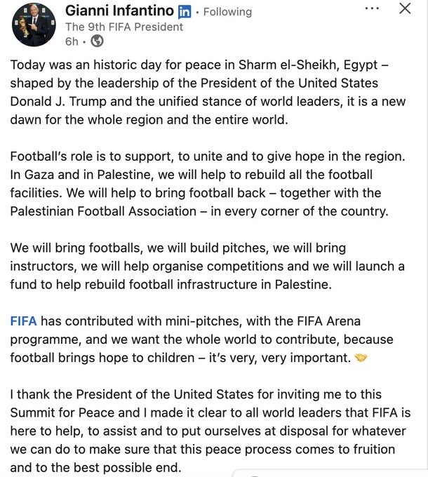 Head Of FIFA Gianni Infantino, At The Gaza Peace Summit Pledges To Rebuild The War Razed Nations With Football As A Unifier, Appreciates Trump Effort.