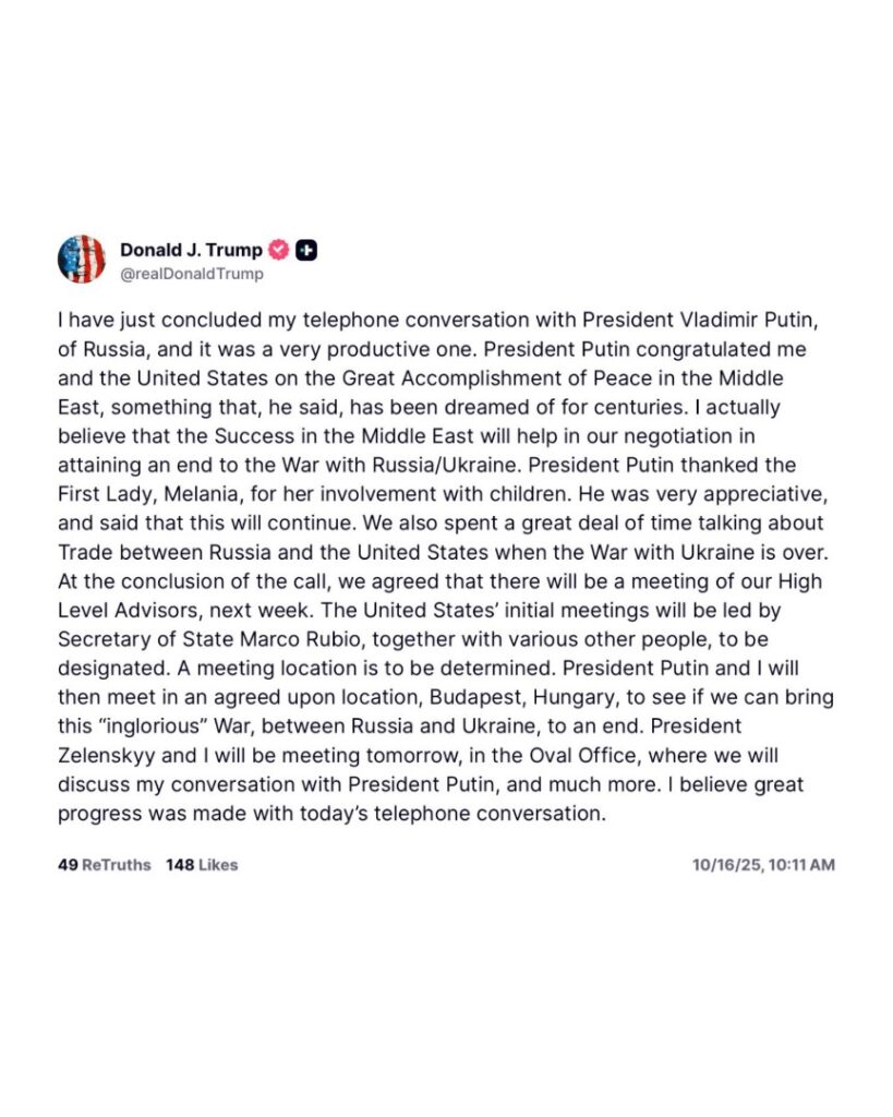 President Trump And Vladimir Putin Agrees To Meet In Budapest, Hungary To Negotiate An End To The Russia-Ukraine War