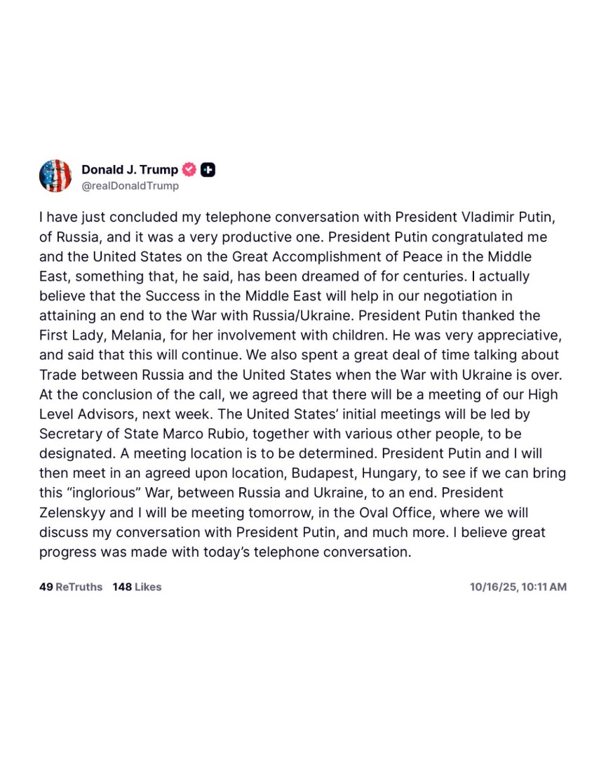 President Trump And Vladimir Putin Agrees To Meet In Budapest, Hungary To Negotiate An End To The Russia-Ukraine War
