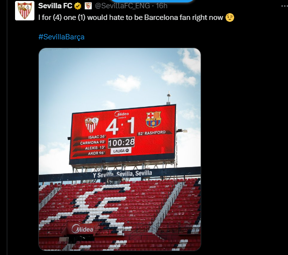NewsSportsSevilla FC Post Mocks Barcelona After 4-1 Victory Match At The Ramon Sanchez Pizjuan On Sunday00 by thesubstancenewsOctober 6, 2025October 6, 2025