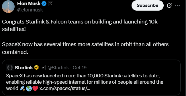 News“SpaceX Now Has Several Times More Satellites In Orbit Than All Others Combined.” Elon Musk Reveal As It Launches 10,000 Starlink30 by thesubstancenewsOctober 21, 2025October 21, 2025