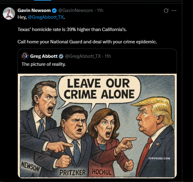News“Texas’ Homicide Rate Is 39% Higher Than California’s.”—Newsom Reacts To Governor Abbott’s Depiction Of California, Illinois And New York Crime Stance Against National Guard Deployment10 by thesubstancenewsOctober 7, 2025October 7, 2025