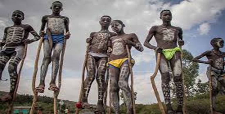 Unmarried young men walked on stilts during community festivals and rituals. A rule for Banna tribe stilts walking during a ceremony (weddings, harvest festivals or cultural gathering) is painting their bodies in white strips.