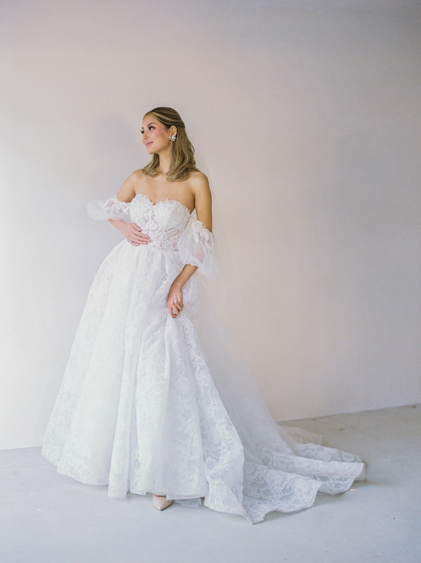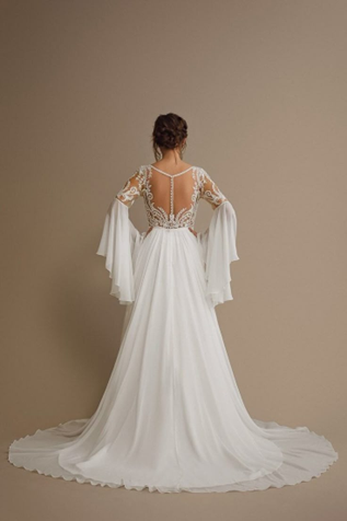 Sleeves are no longer an afterthought. In 2025, expect to see puff sleeves, bishop sleeves, and sheer balloon styles taking center stage. Paired with deep backs or fitted waists, sleeves add a romantic or regal flair.