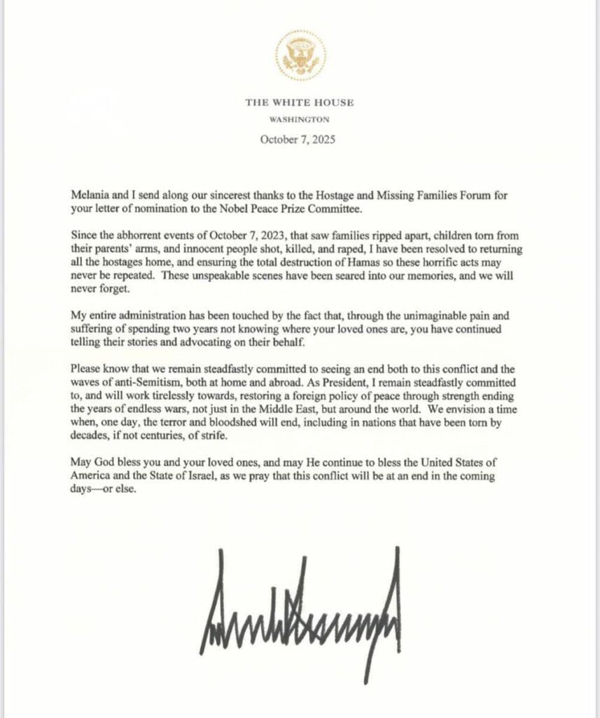 President Trump sent a letter to the Hostages and Missing Families Forum (Families HQ), thanking them for publicly backing him for the Nobel Peace Prize and pledging solidarity with the families. “Melania and I thank you for your tireless work. We remain committed to bringing every hostage home and to ending this conflict,” he wrote, adding that the administration is also committed to fighting antisemitism “at home and abroad.”