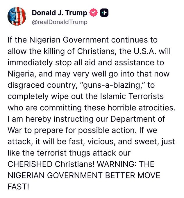 “The killing of innocent Christians in Nigeria — and anywhere — must end immediately. The Department of War is preparing for action.
