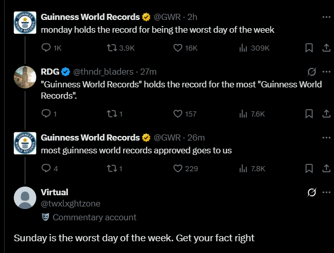 The official account of the Guinness World Record—GWR–shared in a post on X on Monday opined: ‘Monday holds the record for being the worst day of the week.’