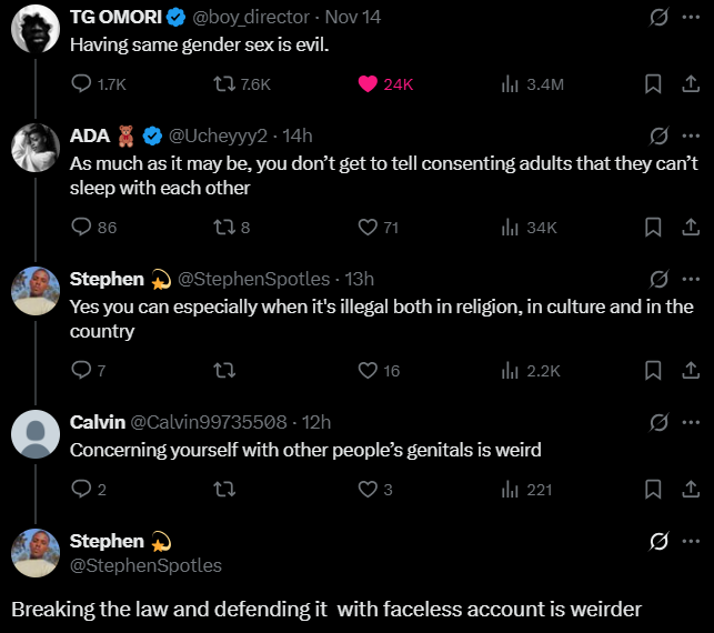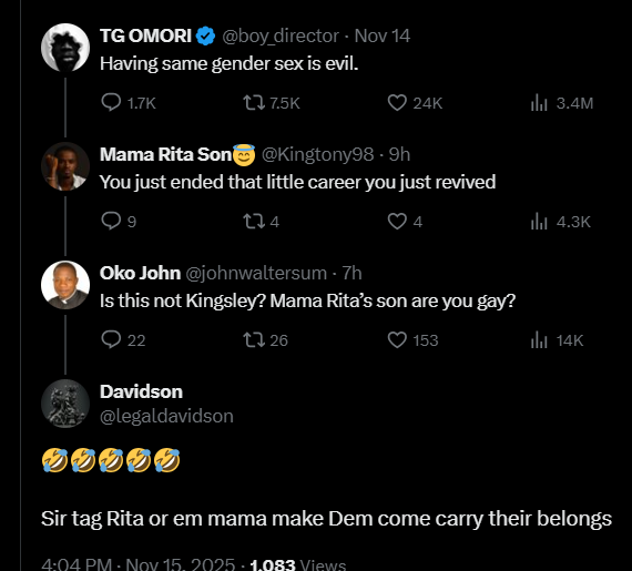 November 15, 2025Hilarious Comment On Nigerian Music Video Director Tg Omori’s Comment Section, Preaching Against Same Sex Relationship