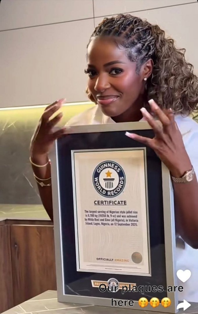 Nigerian chef Hilda Effiong Baci received physical plaques from Guinness World Records on Thursday for her 2023 93-hour cooking marathon in Lagos and her September 12, 2025, preparation of 8,780 kilograms of jollof rice at the Gino World Jollof Festival in Lagos.