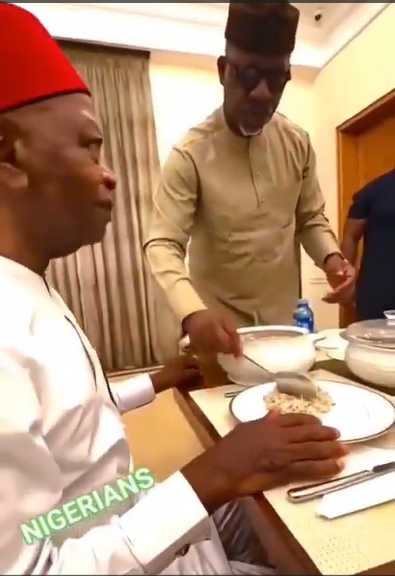 A video emerged showing Ogun State Governor Dapo Abiodun dishing out food to Chief Arthur Eze, CEO of Atlas Oranto Petroleum, during a private gathering at the governor’s residence in Iperu Remo.