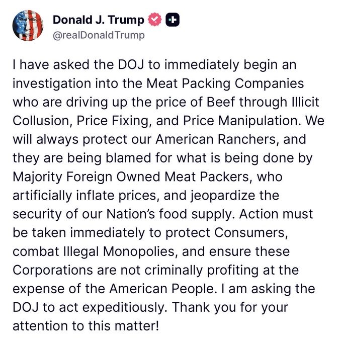 President Trump Directs DOJ To Look Into Meat Packing Companies That Artificially Inflate Prices