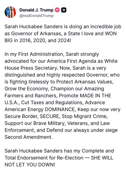 President Trump Endorses Former White House Press Secretary Sarah Huckabee Sanders For Second Term, As Arkansas Governor