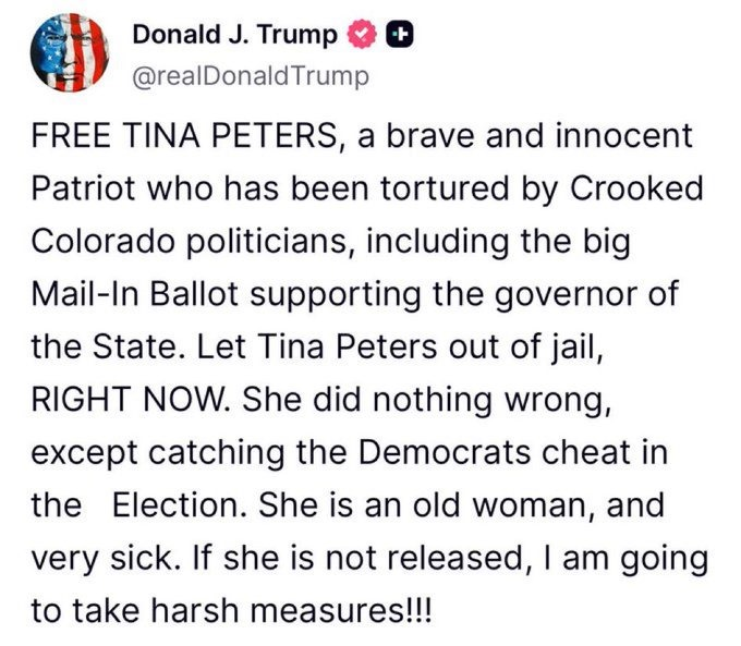 President Donald Trump threatened on social media to take “harsh measures” if Peters isn’t released, citing age and failing health as he called for her release