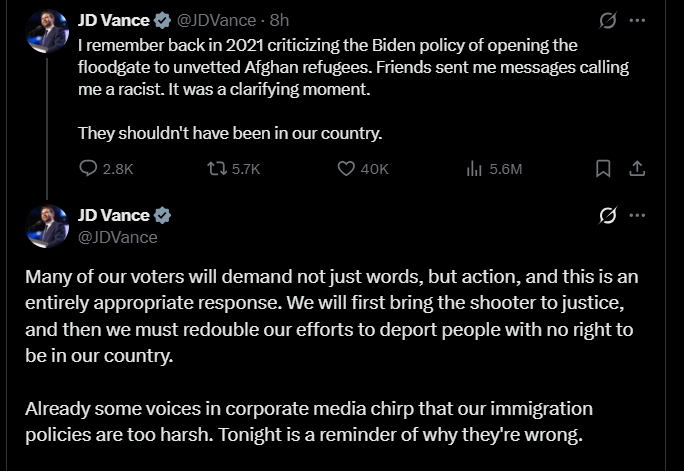 X: vice president vance on Afghan immigrant who shoots two national guards on Wednesday close to the white house