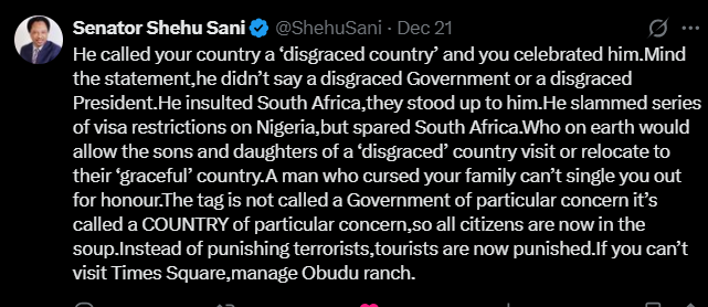 News“A Man Who Cursed Your Family Can’t Single You Out For Honour”—Nigerian Senator Shehu Sani Speaks On President Trump’s Visa Restriction.60 by thesubstancenewsDecember 22, 2025December 22, 2025