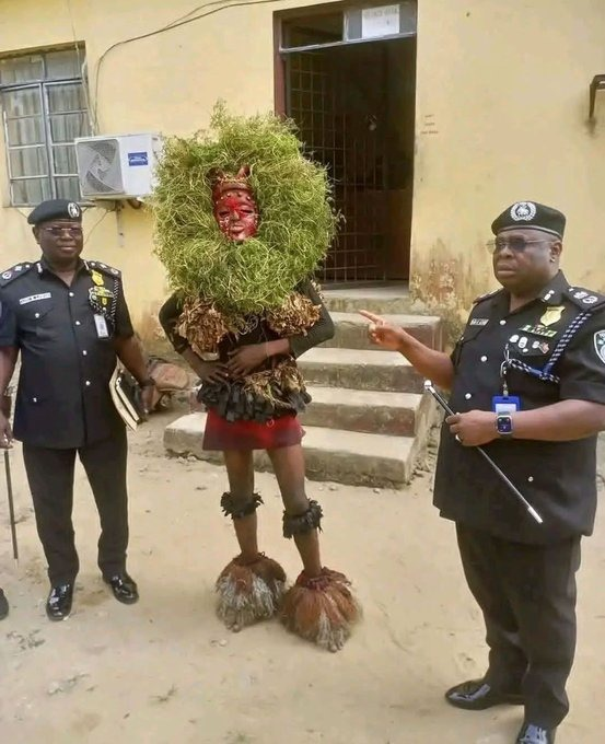 The State Police Command Public Relations Officer Timfon John in a report stated: “Yesterday, a masquerade was arrested for disrupting public peace. one David was unveiled as the human being inside the Ekpo Masquerade paraphernalia. He will have his day in court.