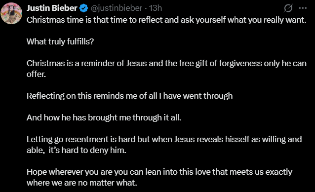 Canadian Musician Justin Bieber, Reflects On His Life And The Love Of Christ In It, Shares Warm Messages To All