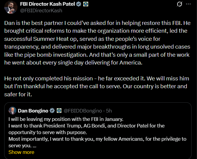 FBI Director Kash Patel Praises Dan Bongino On Retirement Announcement, Says Helps Reform The Organisation