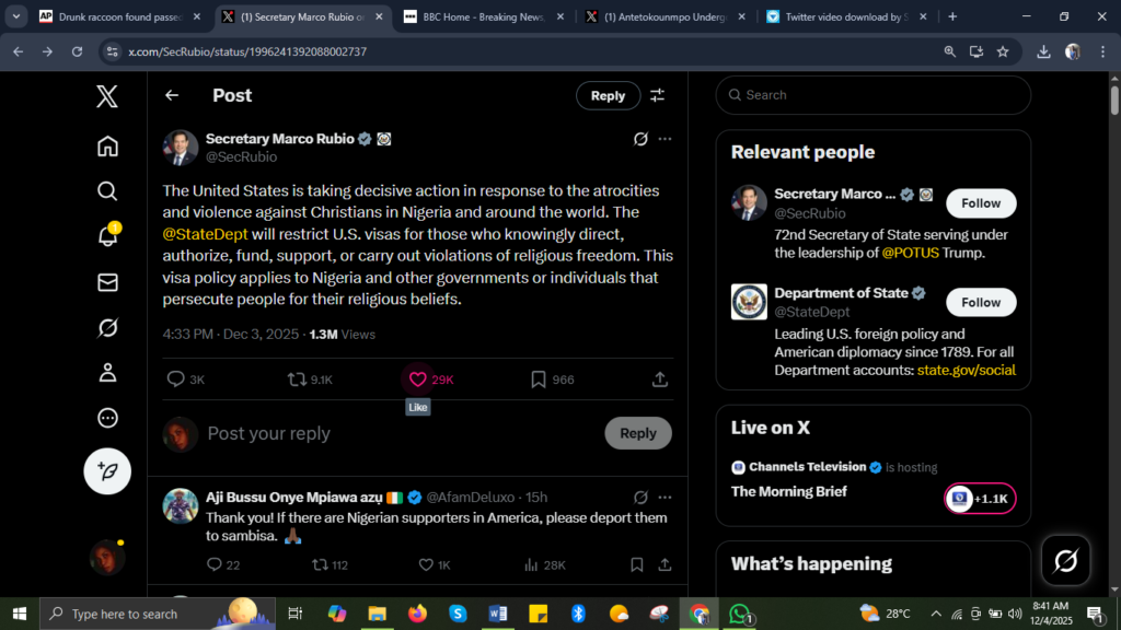 US To Curb Christians’ Persecution In Nigeria, Restrict Visas For Individuals Or Government Who Fund Terrorist Groups In Nigeria.