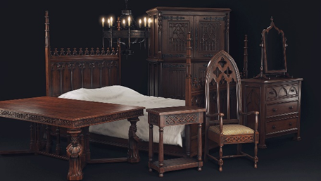 Gothic Revival furniture is solid, often crafted from dark woods like mahogany or oak. Look for carved headboards, throne-like chairs, and elaborate cabinetry that reflect medieval craftsmanship.