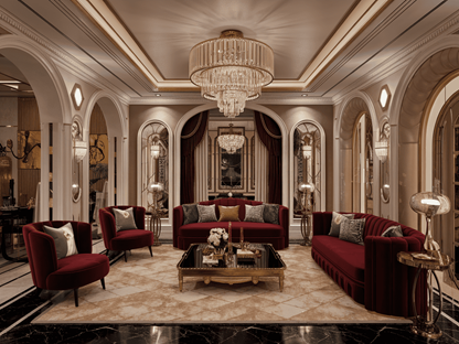 Chandeliers, crystal sconces, and dramatic floor lamps bring sparkle and softness, setting the tone for elegant evenings.