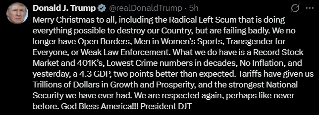 News“Merry Christmas To All, Including The Radical Left Scum That Is Doing Everything Possible To Destroy Our Country”—President Trump Wishes Political Rivals60 by thesubstancenewsDecember 25, 2025December 25, 2025