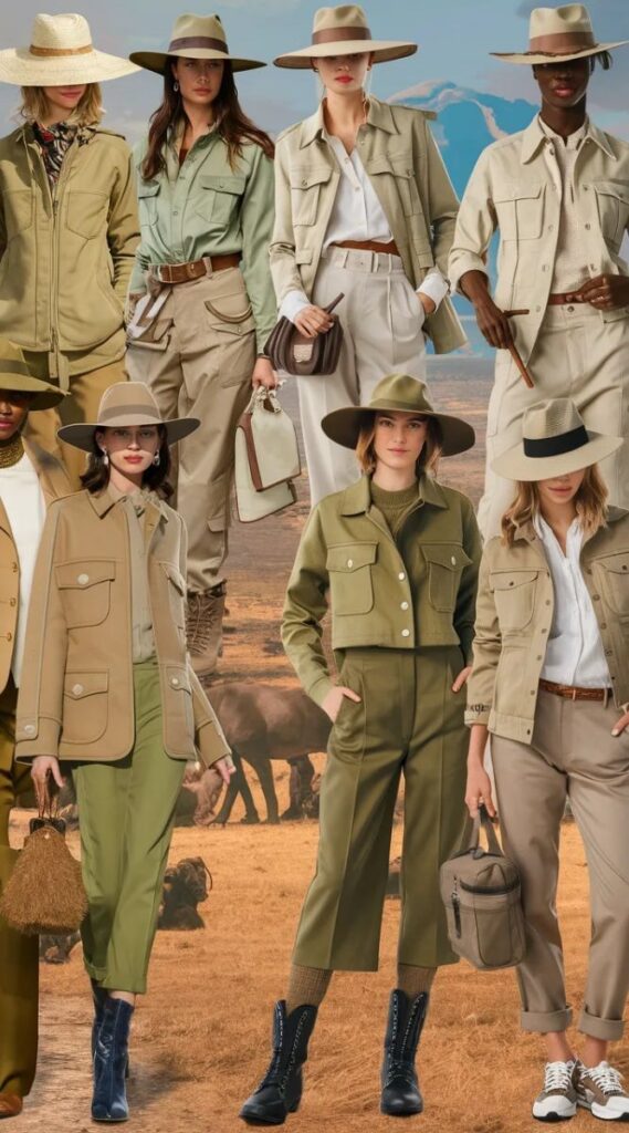 Classic safari pieces include utility jackets with multiple pockets, belted shirt dresses, cargo pants, and tailored shorts. Button-up shirts, often with epaulets or flap pockets, bring structure to the look. Accessories like wide-brimmed hats, aviator sunglasses, and leather boots or sandals add a polished, travel-ready finish.