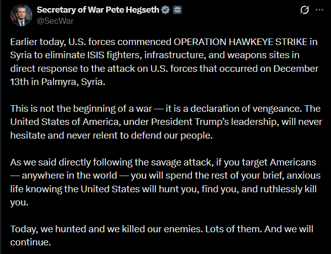 Sectary Of War Announces Vengeance Attack On Syria To Eliminate ISIS Fighters, In Direct Response To The Attack On U.S Forces That Occurred On December 13th In Palmyra.