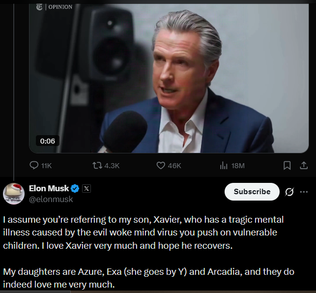 Tech Billionaire Elon Musk Replies California Governor Gavin Newsom, For Shaming Him Over His Trans Kid Xavier, Prays For Son’s Recovery