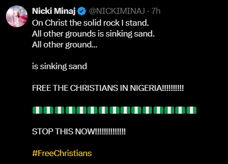Trinidadian Rapper Nicki Minaj, Calls For Freedom Of Persecuted Christians In Nigeria