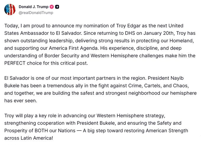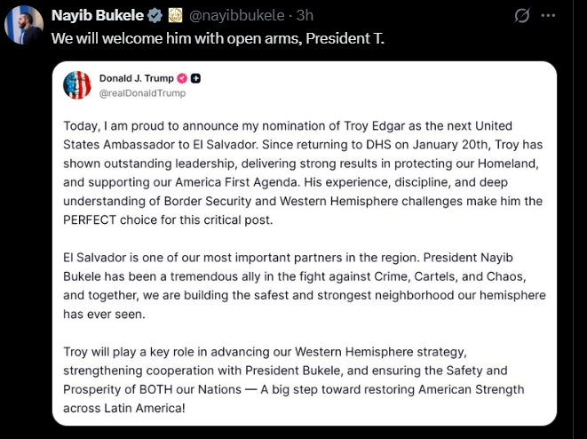 Trump Nominates Troy Edgar As The Next United State Ambassador To El Salvador, President  Nayib Bukele Agrees