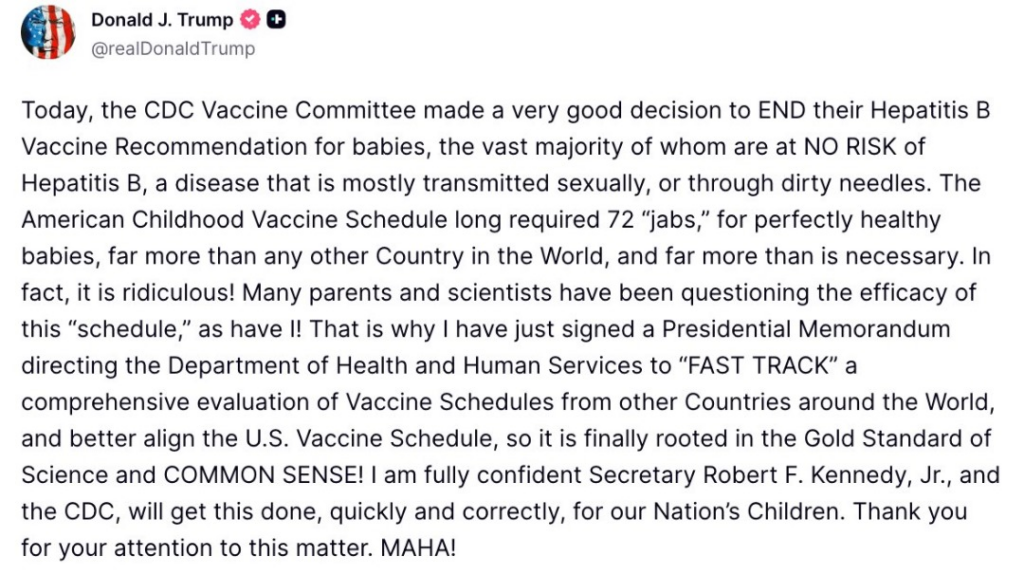 Trump Signs Presidential Memorandum Directing Department Of Health To Fast Track Evaluation Of Vaccine Schedules Around The World To Align The U.S Vaccine Schedule