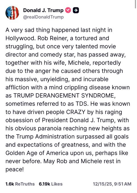 U.S President Mocks Rob Reiner’s Death, Says Recently Deceased Hollywood Director And Actor Dies From ‘Trump Derangement Syndrome’