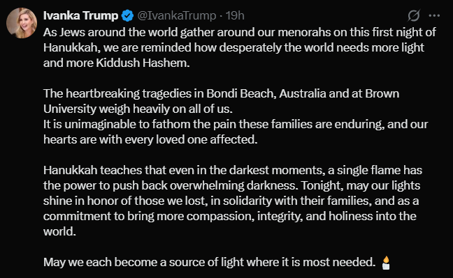 U.S President Trump’s Daughter Ivanka On The Bondi Beach Attack, Says The ‘World Needs More Light’